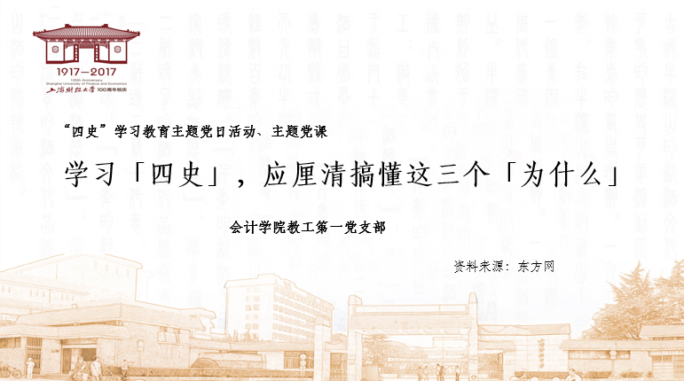 近期,上海财经大学会计学院按照市委《关于开展党史、新中国史、改革开放史、社会主义发展史学习教育的实施方案》等文件精神和上海财经大学党委《关于开展党史、新中国史、改革开放史、社会主义发展史教育的实施方案》的部署要求,学院各基层党支部围绕“党史、新中国史、改革开放史、社会主义发展史”开展了一系列的“四史”学习教育主题党日活动。各党支部充分运用多媒体等载体方法,丰富四史学习的教育形式,对进一步坚定学院广大党员、干部、群众、师生的理想信念、提升党性修养、提高担当作为产生了积极效应。