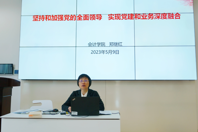 其次,郑继红带领大家原原本本学习《习近平新时代中国特色社会主义思想专题摘编》中“坚持和加强党的全面领导”的相关内容,为大家详细解读为什么要坚持和加强党的领导以及如何加强党的领导。接下来,结合2023年高校党建和思想政治工作重点任务之推进高校党建与事业发展“一融双高”的部署要求,带领大家全面了解上海财经大学融合式特色党建的生动实践,全面认识和把握上海财经大学融合式特色党建的最新成果和升级发展方向。最后,聚焦会计学院融合式党建的主要做法和成效,结合会计学院“一融双高”典型——“黄大年式教师团队”师生党支部的建设,阐述了今后学院在坚持和加强党对学院事业的全面领导下,推进党建与事业发展深度融合、以高质量党建引领高质量发展的思路方法。