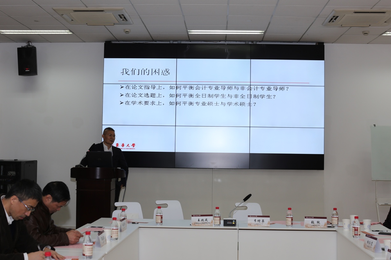 交流会上,全国MPAcc教指委会副主任委员兼秘书长王化成谈到,MPAcc办学过程中,应当按培养目标来设置课程,注意区分学术型硕士研究生和专业型硕士研究生在论文指导上的区别,并从文献回顾、理论基础、行业和制度背景、案例介绍和分析等方面提出了会计专业硕士论文指导的要点。
