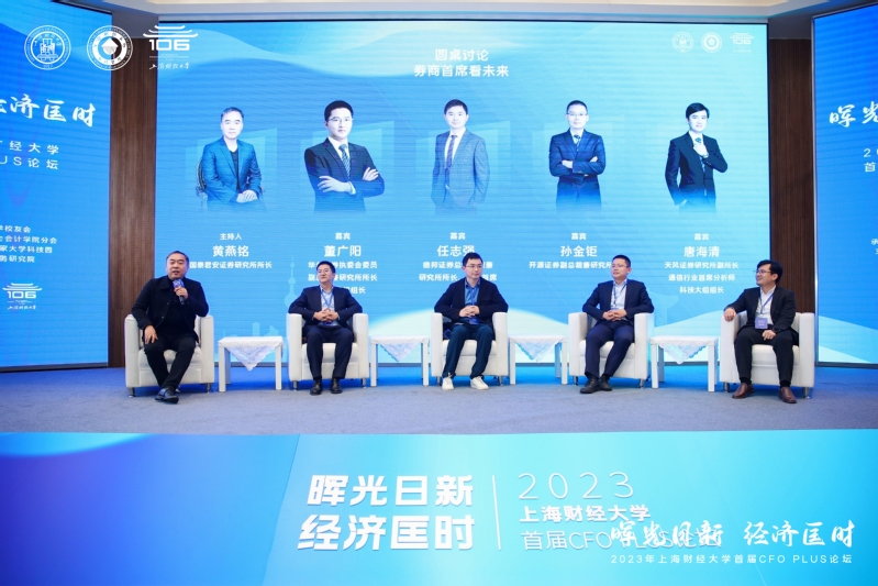 圆桌对话一由国泰君安证券研究所所长黄燕铭主持,华创证券执委会委员、副总裁兼研究所所长、大消费组组长董广阳,德邦证券总裁助理兼研究所所长、周期首席任志强,开源证券副总裁兼研究所所长孙金钜,天风证券研究所副所长、通信行业首席分析师、科技大组组长唐海清五位嘉宾围绕“券商首席看未来”主题展开讨论。