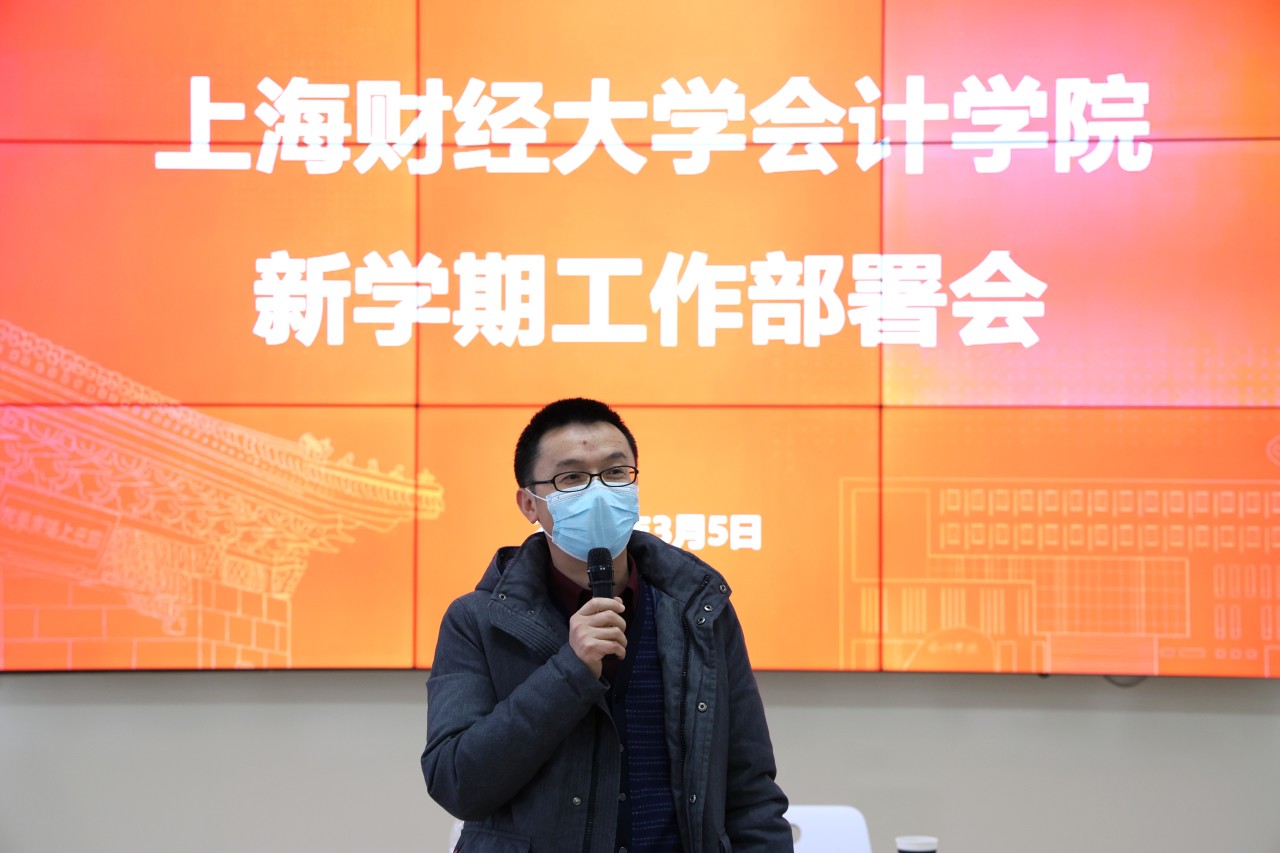 会上,会计学院院长靳庆鲁首先传达了学校在上学期末以及本学期初的工作部署会精神,解读了学校2024年工作要点。其次,他从师资队伍建设、科研课题申报、学科建设发展等方面对学院寒假期间开展的重点工作进行了全面总结。最后,他从人才培养质量提升、学术生态优化、师资队伍建设、教师走进行业产业实践等方面对本学期学院工作进行部署,希望全体教职员工,凝聚共识,持续深耕,奋力开创学院高质量发展新局面。