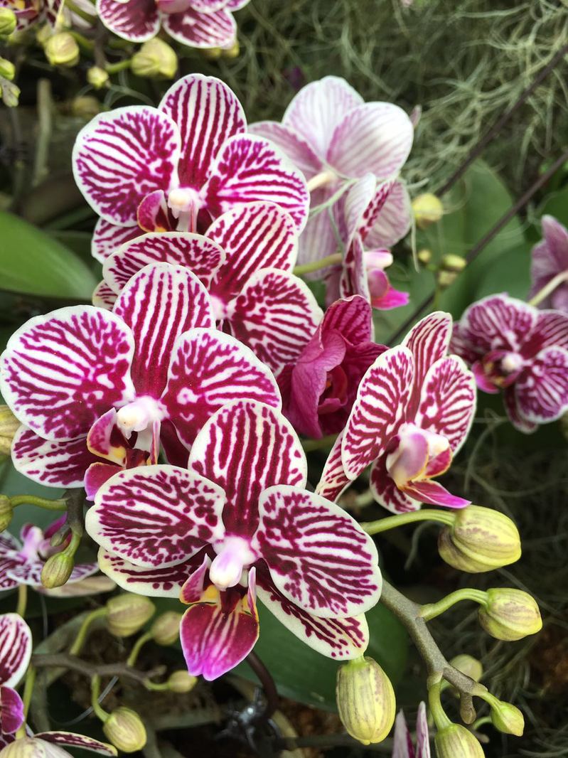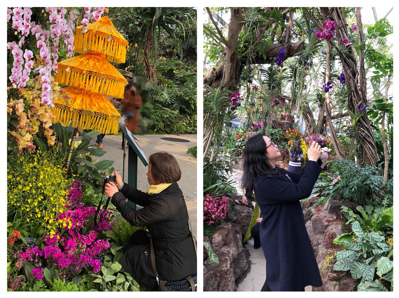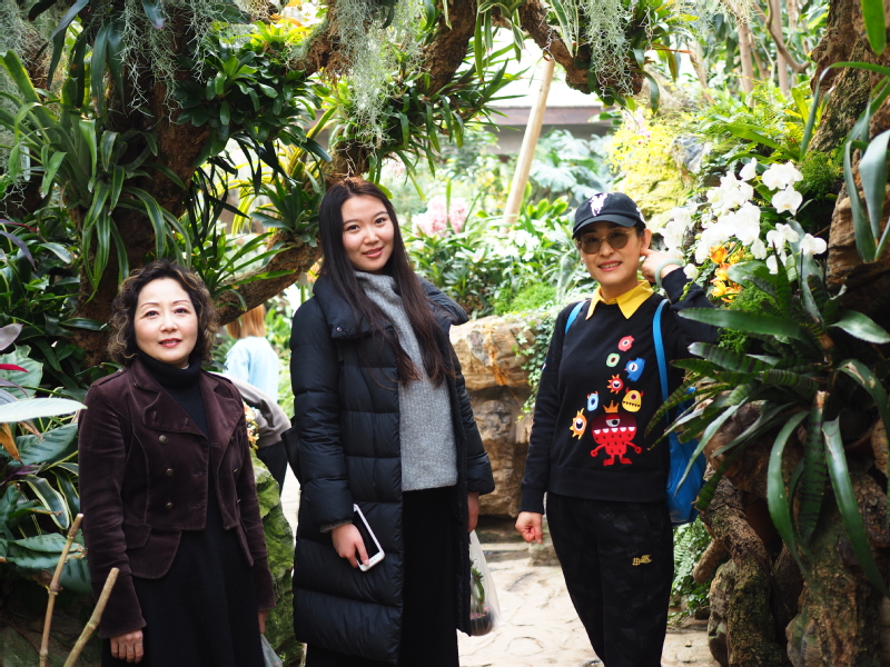 经过樱花大道后,就来到了位于园区的东北角的展览温室。展览温室由热带花果馆、沙生植物馆和珍奇植物馆三个温室馆组成,内部小桥流水,还有瀑布、山洞装饰。恰逢园区正在温室举办国际兰花展,老师们都被这美丽的景色吸引了,纷纷峨影留念。