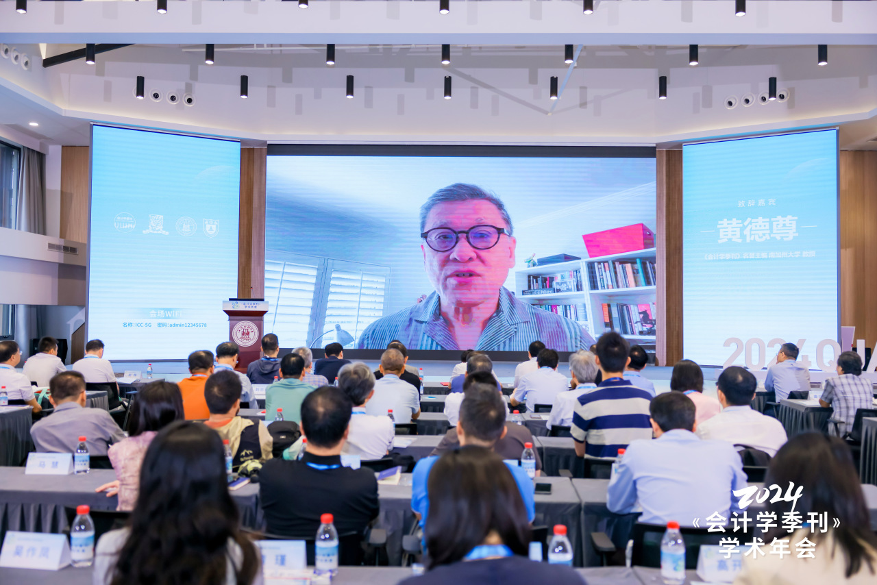 《会计学季刊》名誉主编、南加州大学黄德尊教授在视频致辞中对创办期刊的各位编委的不懈努力,首届学术年会的主办单位、承办单位的辛勤付出及各位同仁对《会计学季刊》的大力支持表示诚挚感谢。他谈到《会计学季刊》是很多会计学人共同的心血,承载了众多的期待,希望未来期刊扎根中国特色制度背景,在挖掘更多有趣学术问题、加强中国研究基础理论、提升科学研究严谨性上下苦功夫、深功夫,成为推动世界了解中国学术研究的一扇窗口,把中国研究推向更高台阶。