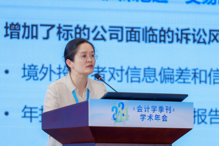 厦门大学饶灿、贵州财经大学殷皓洲、兰州大学孙俊勤、浙江财经大学陈文强、上海对外经贸大学张天舒、上海大学吴澳成以及上海师范大学郭照蕊分别分享了题为《宗族文化能够抑制企业社会责任“表里不一”吗?——来自民营上市公司的证据》《审计委员会召集人内部兼任与内部控制质量:专业溢出抑或关系约束?》《企业研发对中小投资者信息需求的影响:基于交易所互动平台的证据》《业绩考核复杂度与企业高质量发展:赋能还是扭曲?》《资本市场开放与公司业绩预告-基于沪深港通的经验证据》《企业区位竞争与审计师风险应对》《客户之风,言辞之波:客户关系型交易与公司管理层语调》的论文。