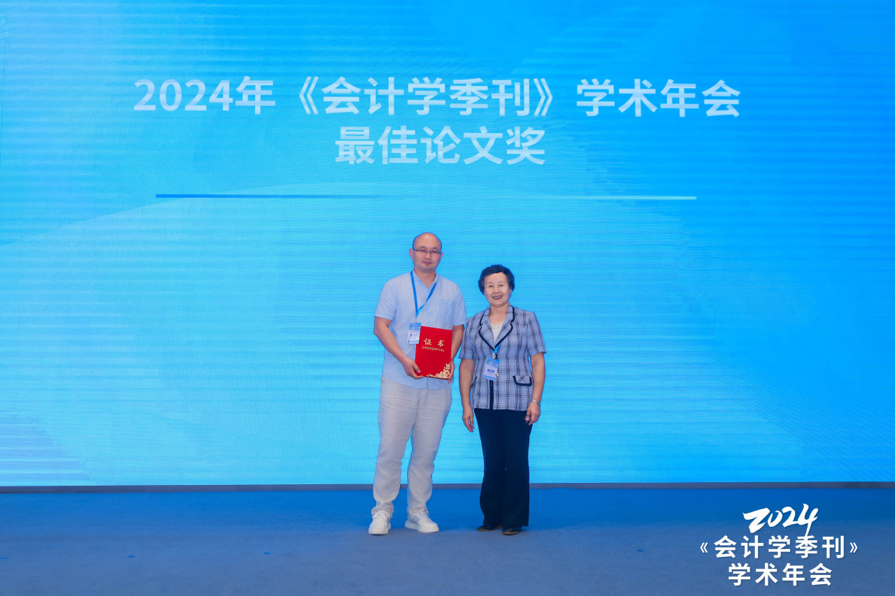 全体参会人员最后通过匿名投票评选2024年《会计学季刊》学术年会最佳论文奖和最佳评论人奖。最终郭照蕊、季婧、黄俊撰写的《客户之风,言辞之波:客户关系型交易与公司管理层语调》一文获评最佳论文奖,阴慧芳获评最佳评论人奖,《会计学季刊》顾问委员会委员、厦门大学曲晓辉教授,《会计学季刊》主编、上海财经大学靳庆鲁教授分别为他们颁发荣誉证书。