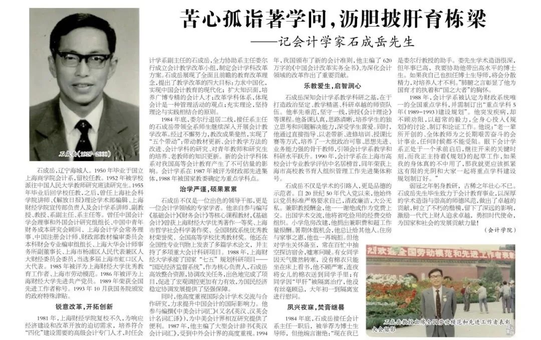 石成岳深知会计学系教学科研之基,在于打造政治坚定、教学精湛、科研卓越的师资队伍。他率先垂范,坚守一线,讲授《会计理论》等课程。他备课认真,思路清晰,培养学生的独立思考和问题解决能力,深受学生喜爱。同时,他通过直接指导、以老带新、进修培训、授课比赛等方式,培养了一大批政治可靠、思想先进、业务能力强的骨干教师,引领会计学系教学和科研水平跃升。1990年,会计学系在上海市高校会计专业教学评估中名居榜首,同年荣获上海市高校教书育人组织管理工作先进集体称号。