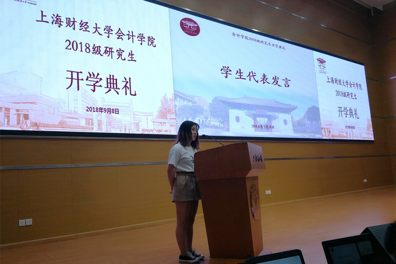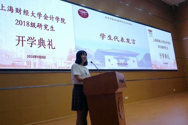 2016级博士研究生马慧同学作为在校研究生代表分享了自己的学习经验。她认为研究生阶段应当保持一颗好奇心,培养自己的研究型思维,抓紧时间学习知识吸收养分,为未来进入社会做好准备。此后,2018级MPAcc精英新生代表,现就职于上海证券交易所的刘紫君同学代表在职研究生新生发表了自己的求学感悟。她谈到尽管同学们已经迈入职场,但是仍然需要保持一颗不断学习的心。最后,2018级会计理论与实务硕士研究生缪蕾同学作为研究生新生代表谈了自己对研究生阶段的憧憬和期许。