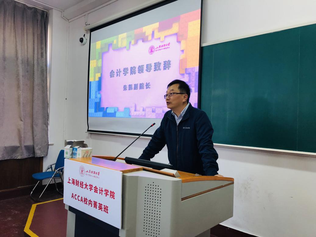 上午九点,开班仪式正式开始,会计学院副院长朱凯教授代表学院发表讲话。首先,朱凯副院长肯定了校内菁英班的学员们在周末早早来到教室学习ACCA的态度,表达了自己对同学们的祝福,鼓励他们在学习ACCA的道路上要持之以恒,祝愿他们能早日考出ACCA。