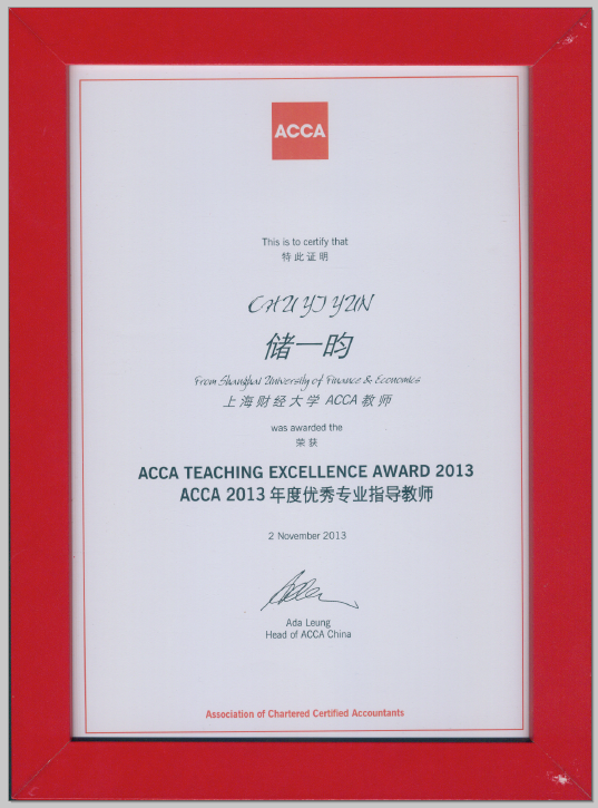 根据各高校推荐及综合评审,依据公正公平的评选标准及原则, ACCA (英国特许公认会计师公会)举办2013 “ACCA年度优秀专业指导老师”评选,我院获得此殊荣的是储一昀教授。