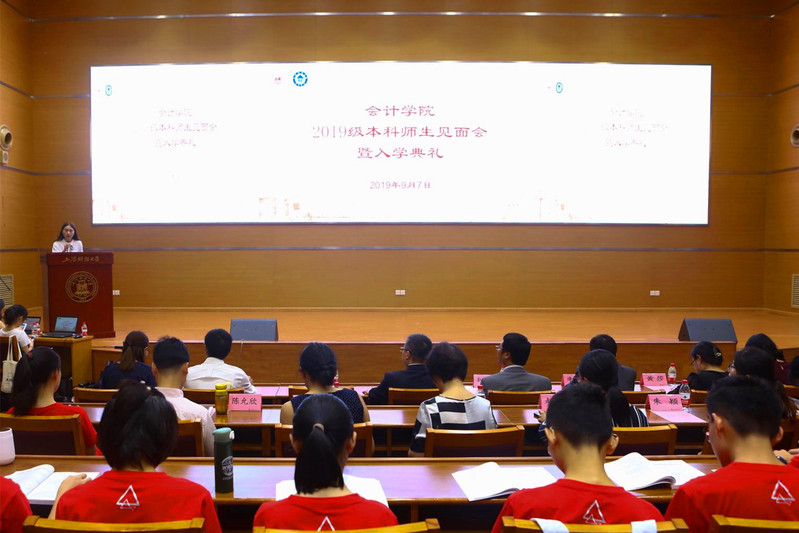 2019年9月7日上午,上海财经大学会计学院2019级本科师生见面会暨入学典礼在创业中心一楼报告厅隆重举行。学院院长靳庆鲁,院党委书记周国良,副院长朱凯,副院长曾庆生,党委副书记黄莎,院长助理唐松,院长助理周波,教师代表叶建芳、阴慧芳等悉数出席了此次典礼,与301名本科新生齐聚一堂。典礼由2019级本科生辅导员徐金花主持。