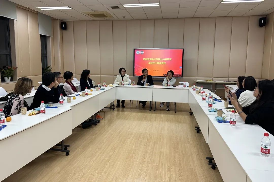 在毕业三十年返校活动中,上海财经大学原副校长、会计学院教授陈信元,会计学院副院长周波等老师接待了1994届校友。陈信元老师向校友们阐述了会计学院改革的历史契机,并畅谈了自己关于人才培养和学科建设的理念。他高度评价了校友在学院建设中的重要作用,表示会计学院在师资力量、人才培养、科学研究等多方面取得的发展成就离不开广大校友的支持。未来,陈信元老师希望各位校友能够继续发挥自身优势,积极参与学院人才培养工作,为学院的改革和发展建言献策。周波老师则介绍了学院近年来的发展成就与未来规划。