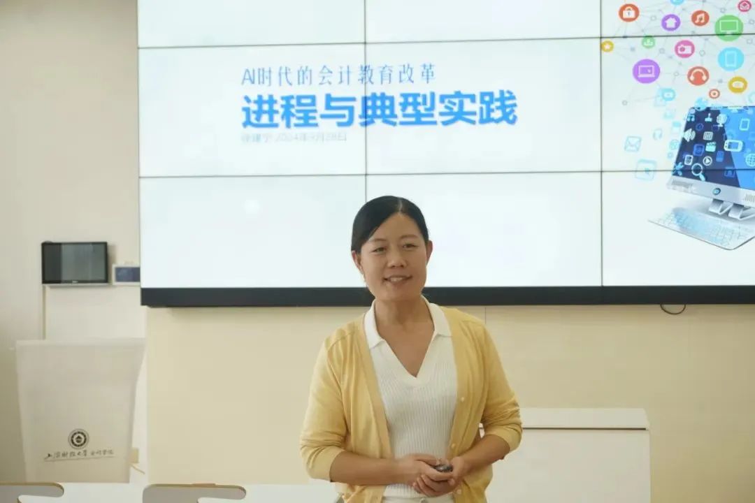2024年10月8日下午,北京东大正保科技有限公司总裁助理、正保网中网副总裁徐建宁以“AI时代的会计教育改革——进程与典型实践”为题,对会计学专业的智能化教学改革进程进行了介绍,从企业端的角度出发剖析目前会计学专业智能化教学改革中所面临的问题与困境,通过实际的案例介绍了传统课程体系、课程内容进行智能化改革的尝试,并就相关问题与学院教师进行了深入的交流与讨论。