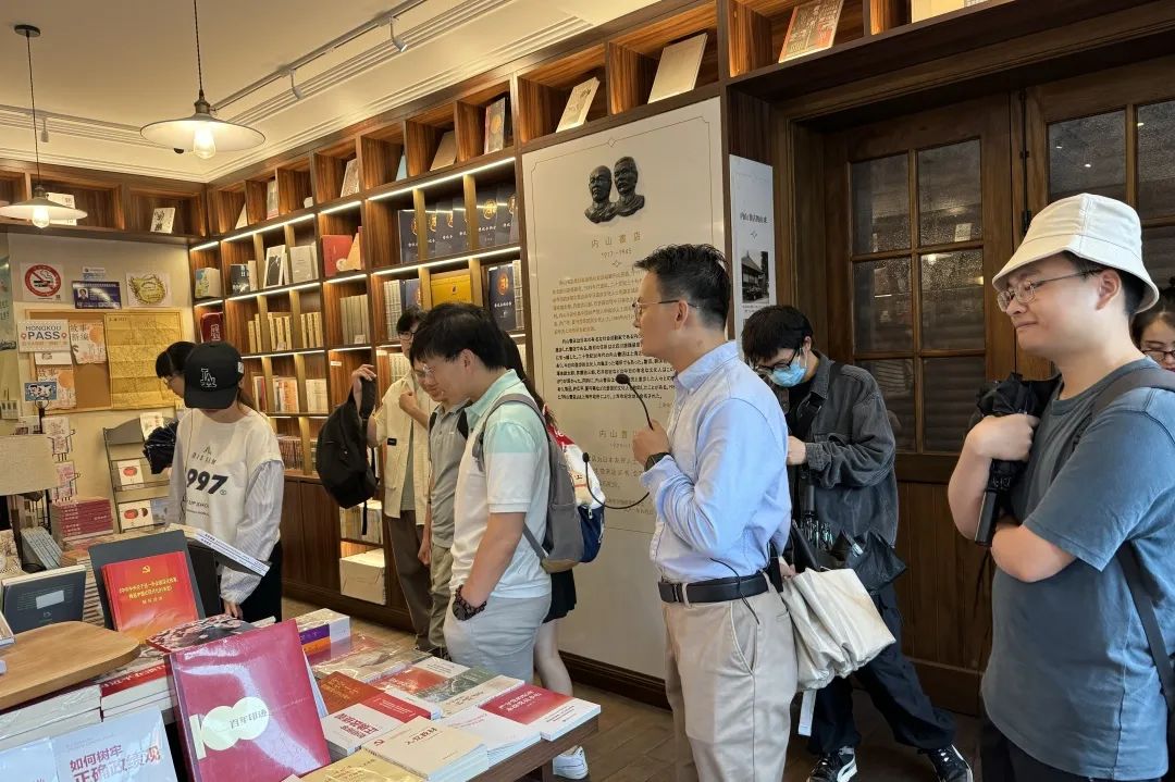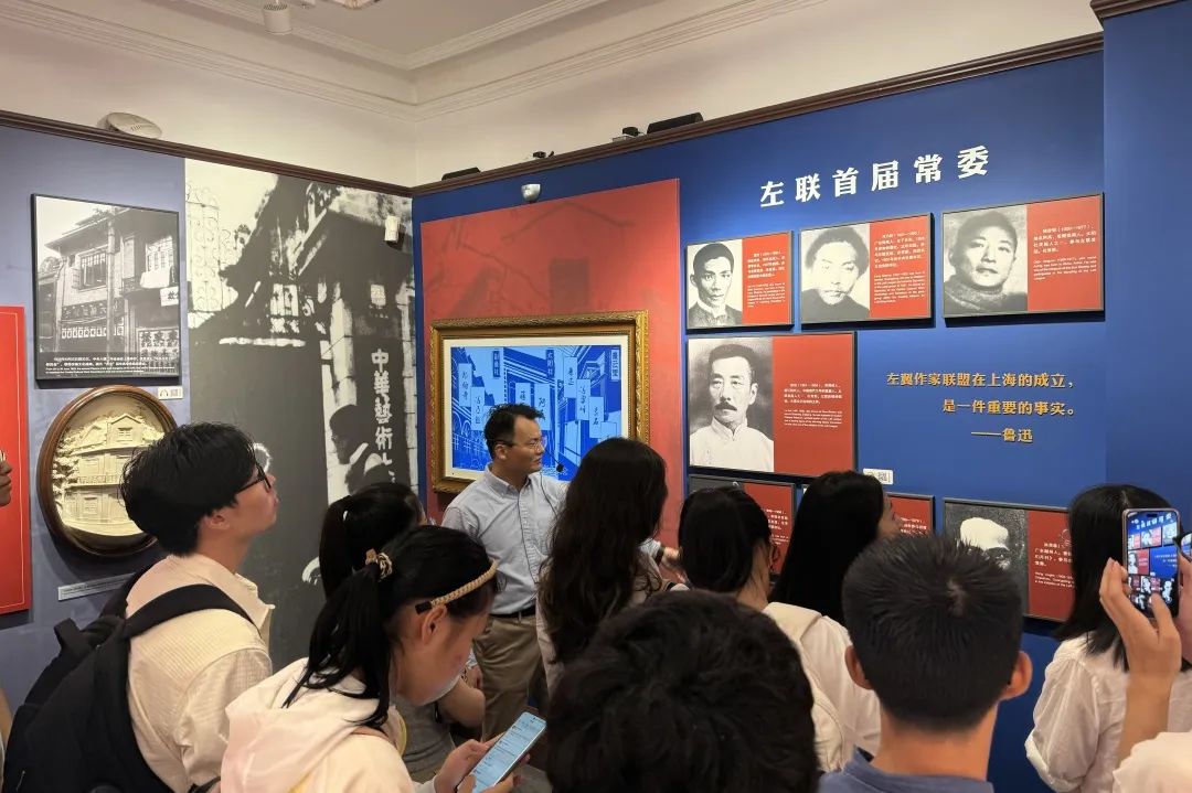 接下来,大家跟随潘老师来到江苏省委机关旧址恒丰里,追忆江苏省委书记陈延年同志的英勇事迹,其坚定信念和不屈不挠的斗争精神激励着每一位师生。内山书店作为中国共产党早期活动的重要场所之一,见证了社会主义思想和马克思主义的传播。行至革命烈士赵世炎故居和中国左翼作家联盟会址纪念馆,师生们被赵世炎同志的光辉事迹所震撼。在深入了解了左联从成立到发展壮大以及如何在中国共产党的领导下进行“文化反围剿”的文化斗争历程,大家深刻体会到了老一辈文人志士坚定的革命精神。