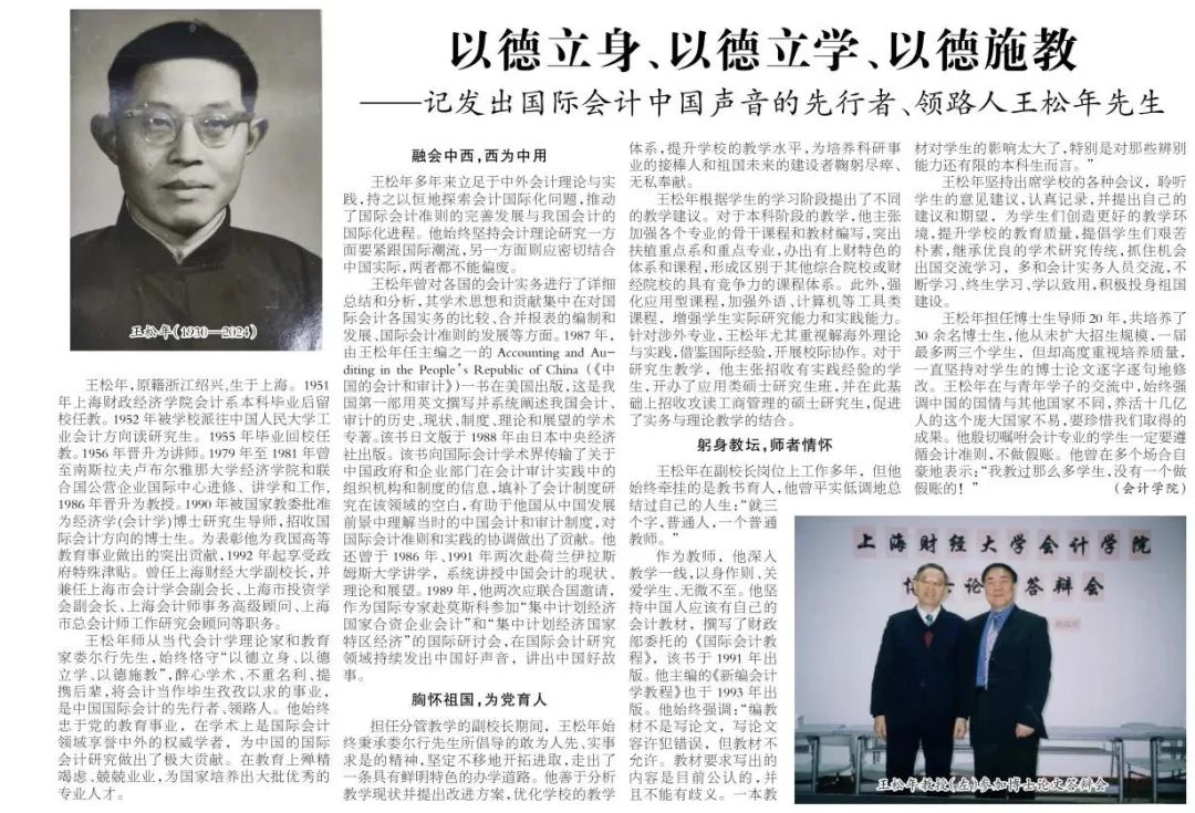 王松年师从当代会计学理论家和教育家娄尔行先生,始终恪守“以德立身、以德立学、以德施教”,醉心学术、不重名利、提携后辈,将会计当作毕生孜孜以求的事业,是中国国际会计的先行者、领路人。他始终忠于党的教育事业,在学术上是国际会计领域享誉中外的权威学者,为中国的国际会计研究做出了极大贡献。在教育上殚精竭虑、兢兢业业,为国家培养出大批优秀的专业人才。