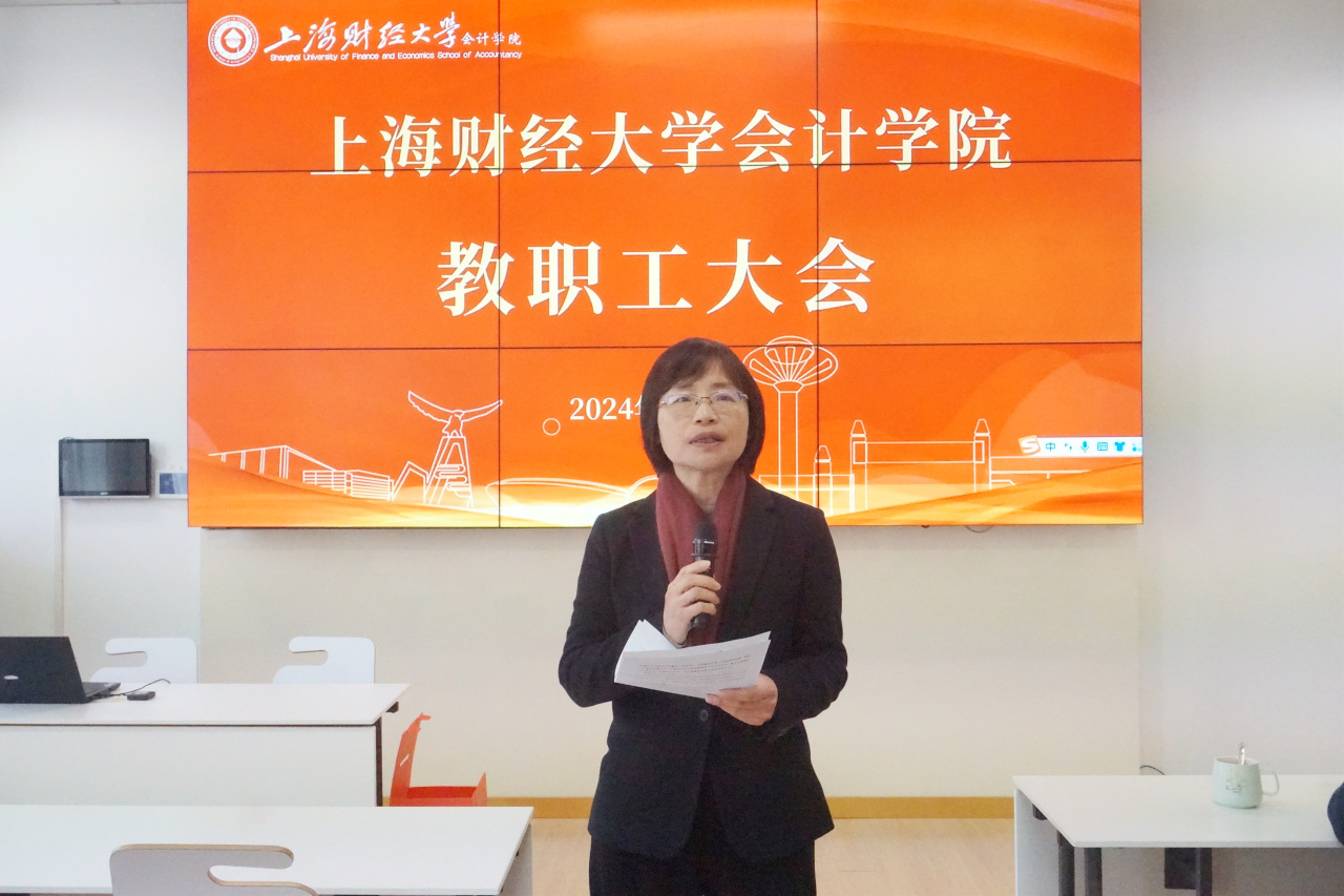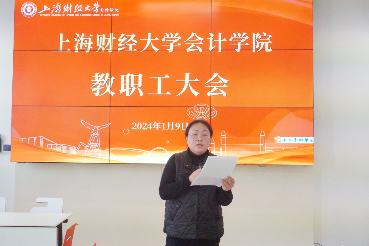 首先召开的是会计学院教职工大会,大会由会计学院工会主席兼校友事务主管高嘉蔓主持。会上,会计学院副院长周波通报了学院2023年财务收支情况以及2024年财务预算方案,并简明扼要阐述了未来财务工作重点。