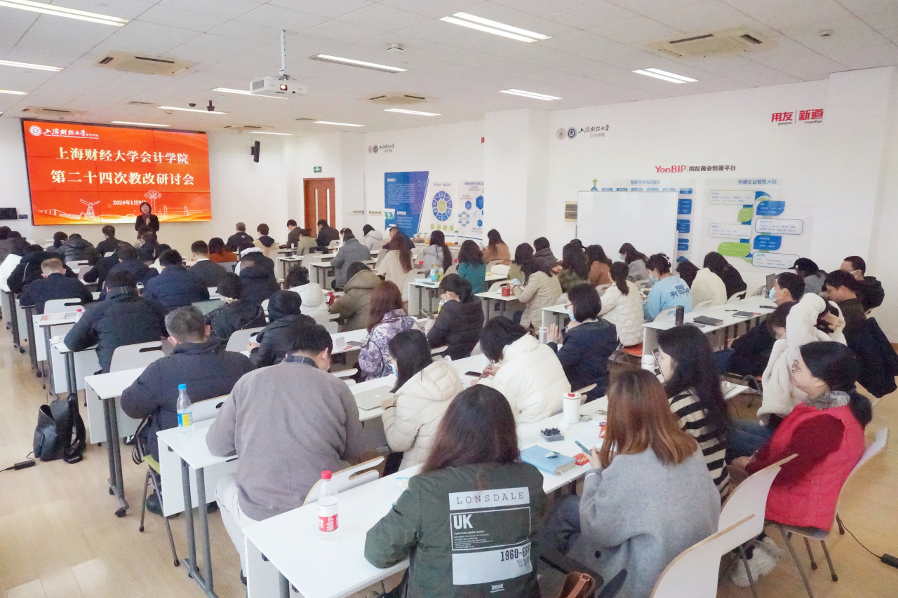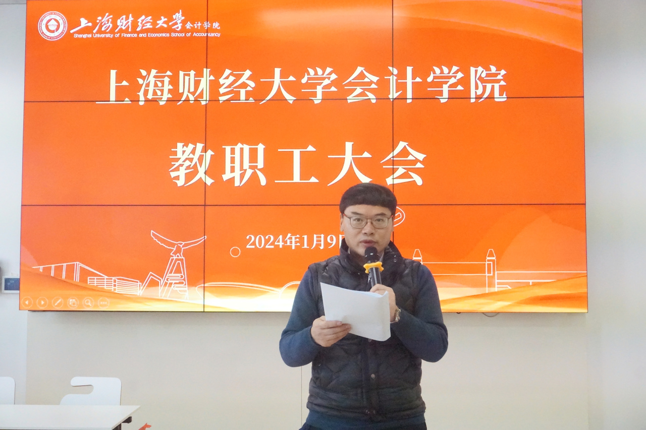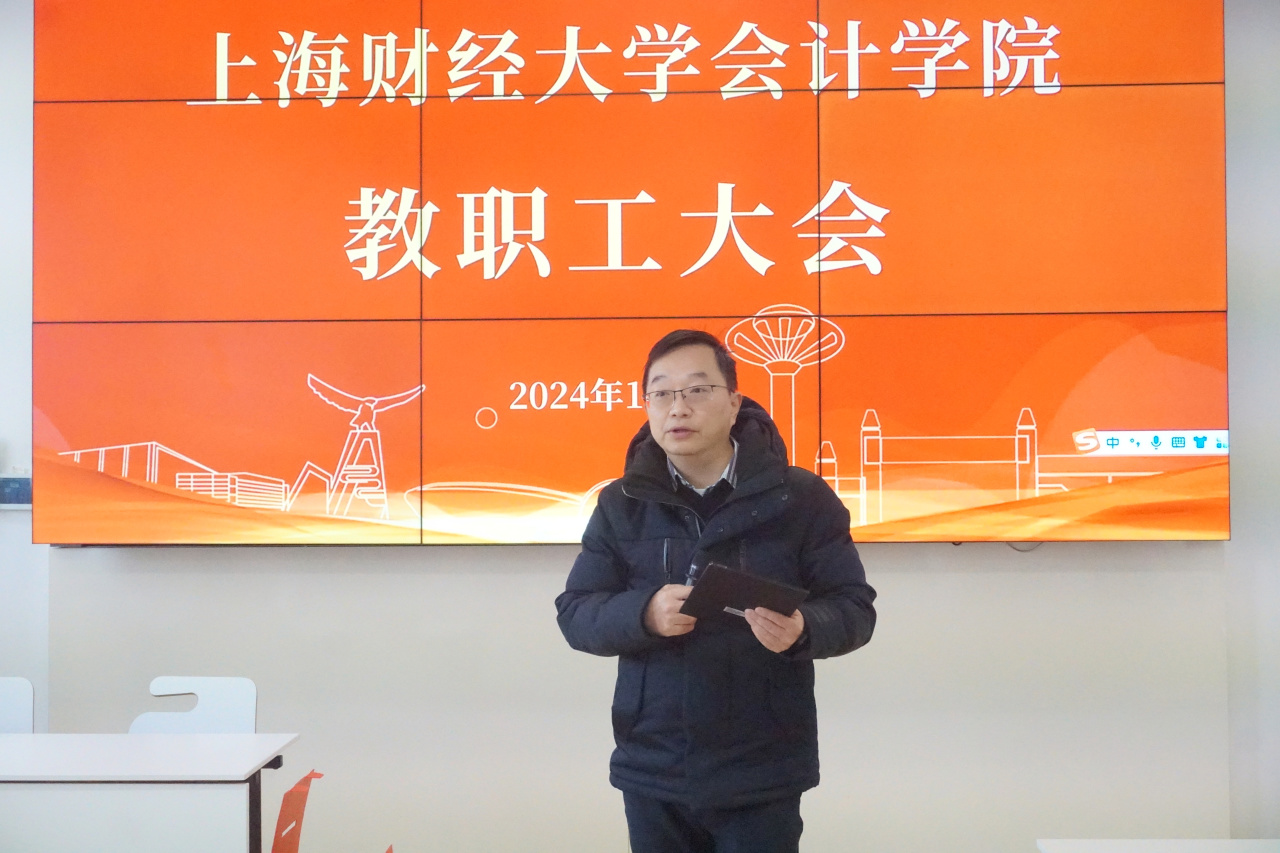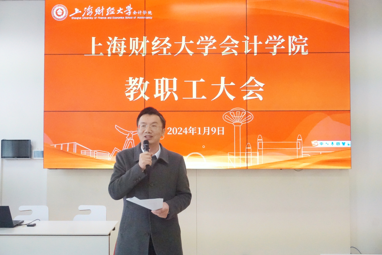 2024年1月9日,上海财经大学会计学院第二十四次教改研讨会暨会计学院教职工大会在学院108室顺利召开。上海财经大学副校长李增泉出席会议并作指导讲话,学院党政领导班子、全体教职员工70余人参加了会议。