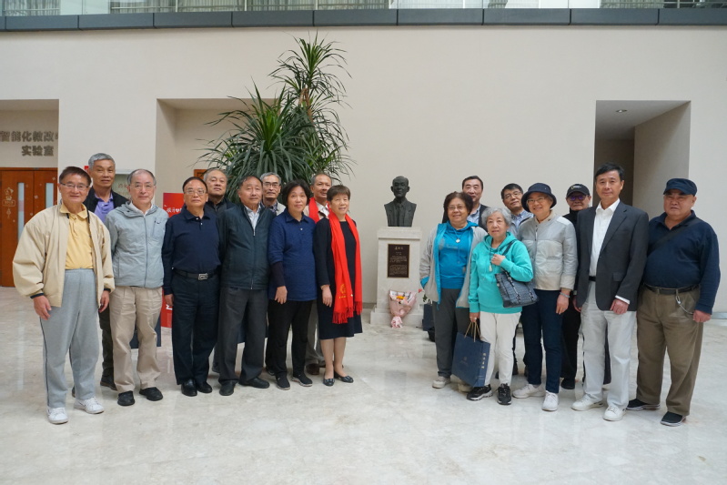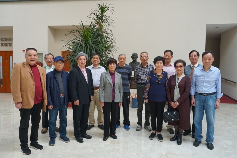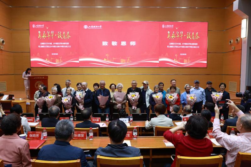 1978级潘飞、黄河清、姜虎年、华逸敏、陈美华与1979级薛跃、陈美君等校友代表年级向老教师代表冯正权、徐逸星等献花,感谢他们当年的培育之恩。