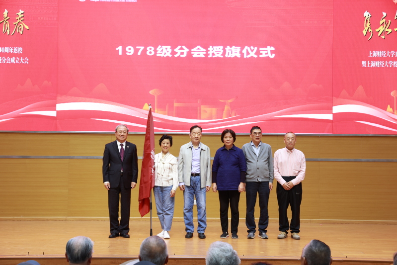 1978级分会副会长徐海根、陈美华,1979级分会的会长吴云飞、副会长尤家荣校友共同参与了年级分会的授旗仪式。