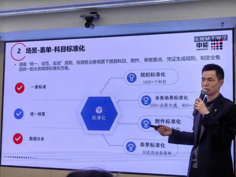 申能集团数字商务实验室秘书长王唯宁先生为大家简要介绍了申能商服的母公司——申能集团的总体情况以及申能共享的建设背景。他表示申能集团2020年新设立申能商服公司作为集团数字化转型实施主体,推进共享服务中心建设和落地。共享中心其标准化、集约化以及对管理资源的释放和重新赋能,为深化集团管控,加快管理职能转型奠定了基础。随后,他通过申能集团推出的“申享通”数字化共享服务平台分析了参访师生现场填写的问卷信息,向大家展示了什么是信息“标准化”的作用以及“标准化”信息建设对数字化转型实践的重要性,分享了财务数字化转型总体设计和实施路径。