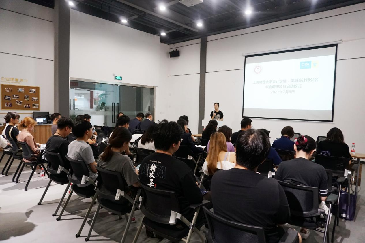 7月8日晚,上海财经大学会计学院和澳洲会计师公会联合调研项目启动仪式在上海财经大学国家大学科技园顺利举行。德勤全球中国服务部主席、德勤中国副主席、澳洲会计师公会华东和华中区委员会委员、澳洲资深注册会计师洪廷安,上海心玮医疗科技股份有限公司首席财务官、澳洲注册会计师张涵,澳洲会计师公会华东和华中区区域总监龚浩莹,上海财经大学会计学院党委副书记黄莎,院长助理唐松,院长助理周波,教授叶建芳,MPAcc中心副主任潘雪及暑期调研师生共同参与项目启动仪式。