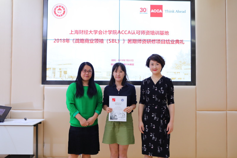 7月22日下午,SBL研修课程结束之际上海财经大学会计学院副院长朱凯教授以及ACCA华中区首席代表朱晓云女士分别作了结业典礼致辞。双方表示,此次师资培训基地的成功建立标志着双方合作迈入崭新阶段,该基地旨在进一步提升中国本土国际化高端财会人才培养水平,为ACCA专业师资提供一个教学交流的平台。未来双方将携手合作,把师资培训基地打造成跨校教学和科研合作的示范平台,为推动我国高端财会人才培养和会计学科长足发展做出贡献。最后,朱晓云女士与上海财经大学会计学院院长助理饶艳超副教授一同为参与此次培训的老师们颁发了结业证书并合影留念。