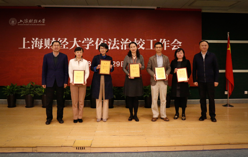2018年11月29日,上海财经大学依法治校工作会议在我校行政楼会议室举行。会上,校党委书记许涛和校长蒋传海为校内依法治校示范单位颁发奖牌。