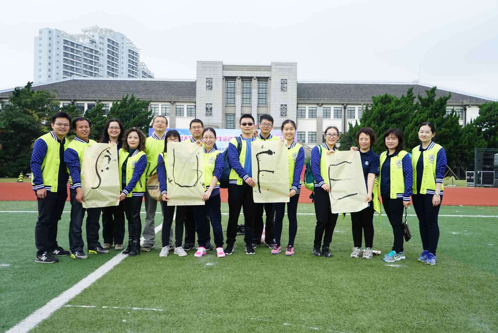 上午还进行了趣味项目,共有三项。第一项是无敌风火轮,又名车轮滚滚,由10名选手配合完成来回各30米的传送,要想步调一致,看清前进方向和灵活转身,还真有难度。娱乐一下,热身一下就好,我们老师坐办公室太久,还真需要多放松HAPPY!第二项是指压板跳绳,又名“多么痛的领悟”,派出15人次选手,在凹凸不平的指压板上,每人次必须完成15个跳绳,以全部完成时间的快慢决出名次。厚袜子这时最能派上用场,我们团结一心,不怕苦不怕痛,还发扬风格将厚袜子借给了竞争对手法学院(也是最后的冠军)。正如宣传语所言,大家跳完的感受就是那么的酸爽!第三项是神笔马良,每个参赛队分为4组,每组6人,每人牵住一根绑在笔上的绳子,按顺序配合写出我们财大的英文简称“S-U-F-E”中的四个字母,也是按完成时间快慢决出名次。这项活动挺有趣,搬运神笔挺折腾人的,写出哪怕一个字母都很费劲,但活动创意很特别,充满着笑点,大家玩得很开心。