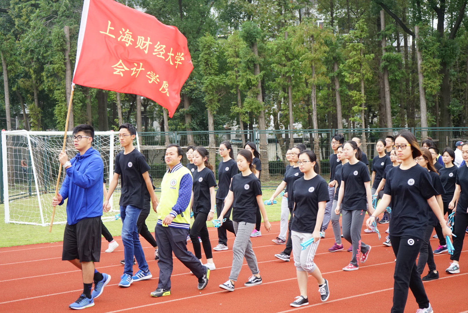 在这项参赛规模最大(全院43人报名参赛,占比达60%)、连续用时最长(集中在一天内举行)的比赛中,对学院工会的组织能力是一个严峻的考验,也最能检验学院和谐奋进的精神面貌。我们学院不负众望,经受住了考验,一如既往地展现了快(会)马加鞭、继(计)往开来的威武雄风!学校运动会上午顺利开幕,担心多时的雨水不忍相扰,选择了擦肩而过,我们财大的气场就是强大。8:15集合,举行了隆重的入场仪式,我们会计学院作为上届冠军排在第一个入场,很是荣耀,我们的腰板比谁挺得都直。作为入场仪式的一部分,操练多时的绳操表演率先进行,妙趣横生,再加上老师们影视明星般的颜值、婀娜的身姿,惹得观众多有感慨,“年轻就是好啊”!