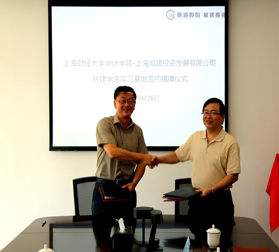 首先由会计学院周国良书记致辞,他简要介绍了学校和学院近年在招生、培养和科研等方面的发展情况,并感谢上海城建投资发展公司给予学生实习锻炼的机会,同时表达了愿意为城投公司提供优秀人才,积极加强校企合作,使双方达到双赢的愿景;接着,上海城投发展有限公司王炯董事长也简要介绍了该公司的发展情况,并感谢上海财经大学会计学院为其公司输送了许多优秀人才,期望与财大通过课题研究加强合作和交流的意愿;随后,上海城投公司的总经济师井陆峰先生简要地发布了现阶段该公司能提供的学生实习岗位和岗位要求;最后,周国良书记和王炯董事长共同签订了上财会计学院与上海城投发展有限公司的学生实习基地协议,并一起为实习基地揭牌。