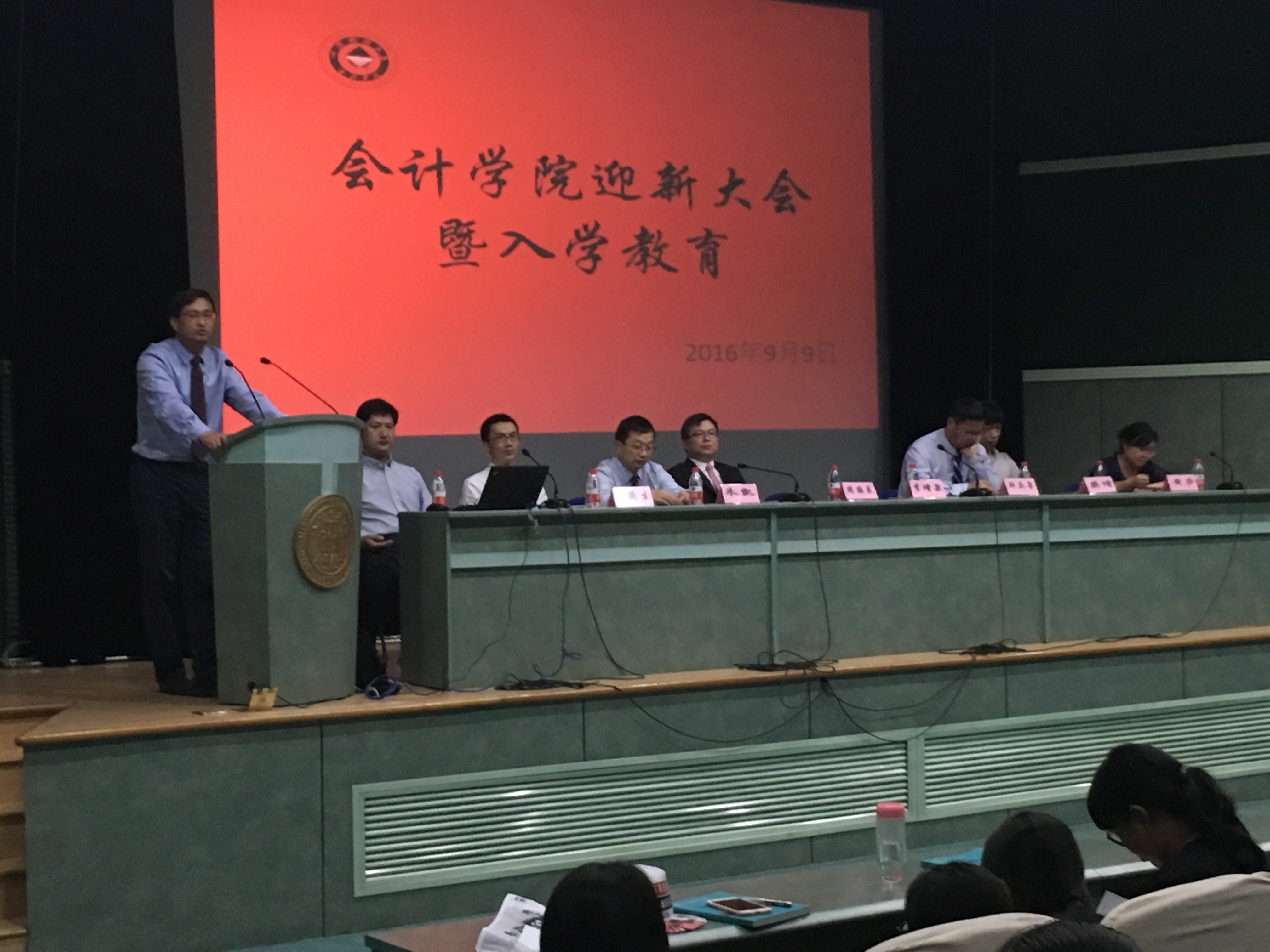 9月9日下午,上海财经大学会计学院2016级新生开学典礼暨师生见面会在行政楼二楼报告厅举行。学院院长李增泉老师、党委书记周国良老师、副院长靳庆鲁老师、副院长朱凯老师、党委副书记黄莎老师、院长助理曾庆生老师、教师代表樊增老师及年级辅导员出席典礼。