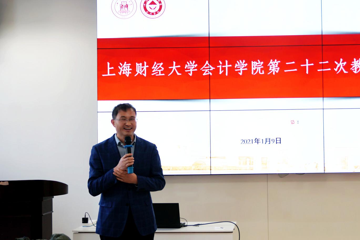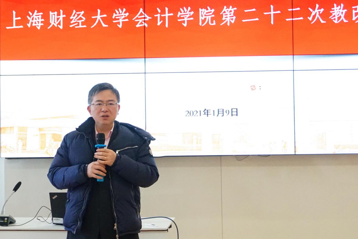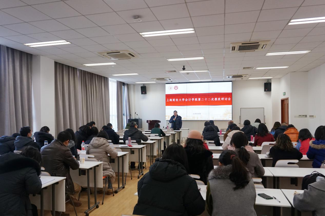 2021年1月9日,上海财经大学会计学院第二十二届教改研讨会在学院108室召开。校长助理李增泉出席会议并作指导讲话,学院党政领导班子、全体教职工70余人共同参加会议。本届教改研讨会由院党委书记周国良主持。