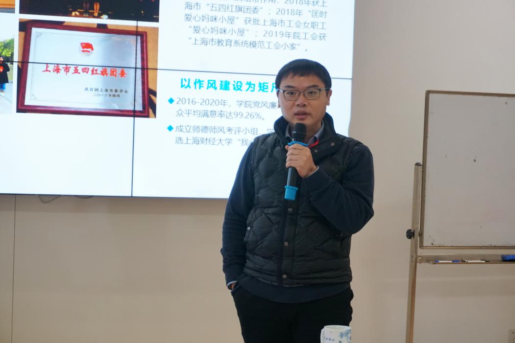 随后,会计学院副院长朱凯汇报了2020年学院财务收支情况以及2021年财务预算方案。此外,朱老师着重从思政指南构建、思政教学方法示例以及课程教学大纲等方面,就“十四五”期间学院课程思政教学指南的编制工作进行了介绍,并鼓励广大教师积极开展课程思政建设,将思想政治教育融入专业课程教学和改革的各环节、各方面,实现立德树人润物无声的功效。