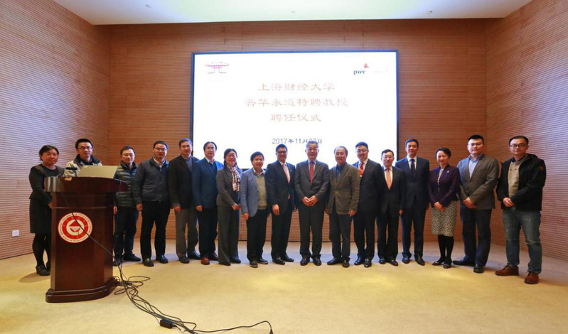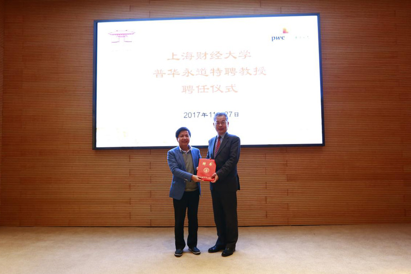 11月27日下午,上海财经大学“普华永道特聘教授”聘任仪式在会计学院109报告厅成功举行。捐赠方代表普华永道亚太及大中华区总裁赵柏基、中国审计主管合伙人李丹,中国中区咨询服务部主管合伙人李明,上海金融服务主管合伙人许康玮,会计专业咨询与服务主管合伙人金以文,北京金融机构合伙人姜昆及校方代表上海财经大学副校长方华,副校长陈信元,校合作发展处处长、教育发展基金会秘书长陈红梅,校合作发展处副处长、教育发展基金会副秘书长王峰,校党委教师工作部副部长、人才工作办公室副主任刘艳辉,会计学院特聘教授张为国,会计学院院长李增泉、副院长靳庆鲁和朱凯、党委副书记黄莎、院长助理曾庆生共同出席本次活动。仪式由校党委教师工作部部长、人事处处长、人才工作办公室主任程霖主持。