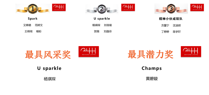 经过一天精彩展示与互动,最终由4名分别来自上海财经大学和山东大学的选手组成的“Spark”团队夺得冠军,澳门大学和中山大学选手组成的“U Sparkle”团队获得亚军,伦敦政治经济学院和厦门大学马来西亚分校选手组成的“精神小伙成双队”团队获得季军。在个人奖项中,澳门大学选手杨琪琛同学获得“最具风采奖”,香港理工大学选手黄碧璇同学获得“最具潜力奖”。比赛结束后,参赛选手和评委、嘉宾以及赛事工作人员进行了更加深入地沟通交流。