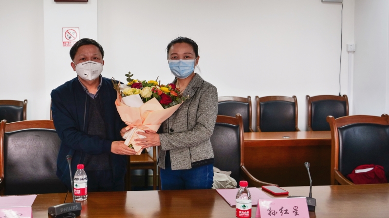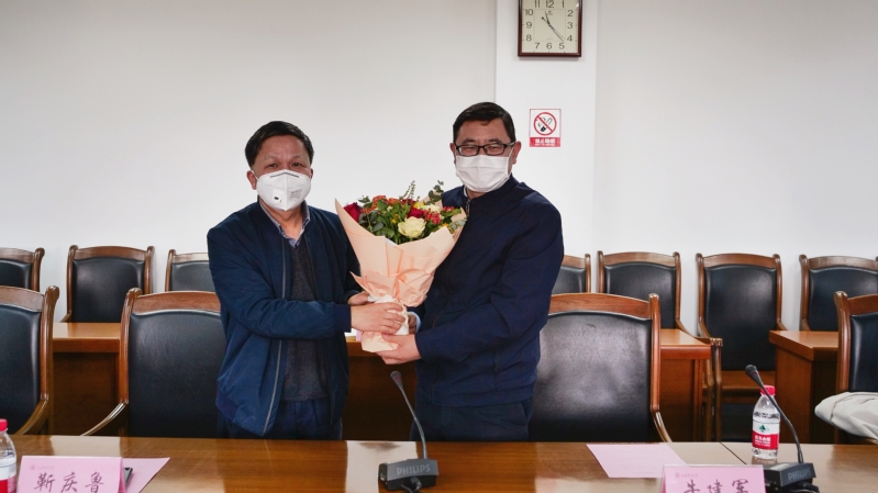 最后,陈信元副校长为牛建军、孙红星两位援疆教师献花,两位援疆教师进行交接仪式,与会人员一起合影留念。