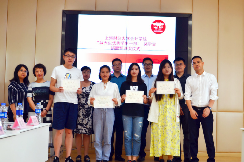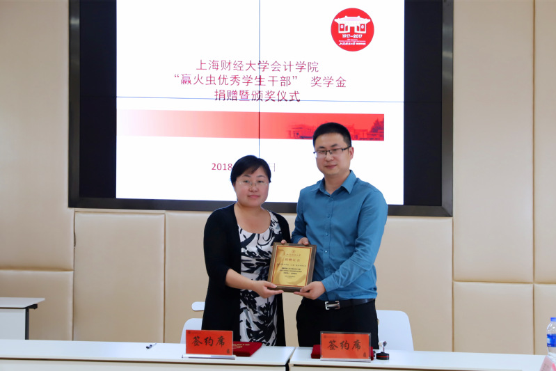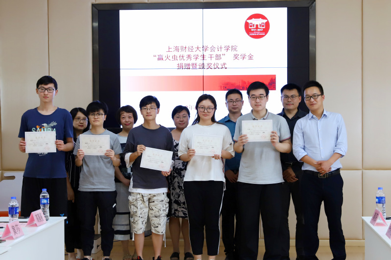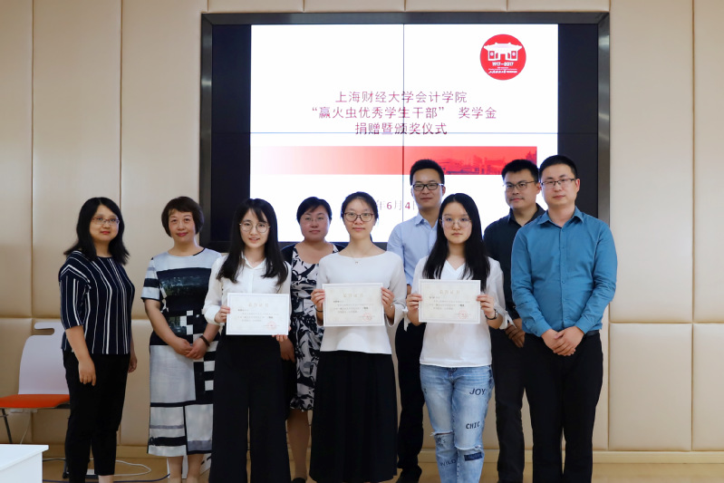 2018年6月4日,赢火虫优秀学生干部奖学金捐赠仪式在学校会计学院106会议室举行,赢火虫信息科技(上海)股份有限公司创始合伙人吴要康、运营总监张家龙、品牌经理秦阳、运营经理王尚玥,上海财经大学合作发展处副处长、基金会副秘书长王峰,会计学院党委副书记黄莎,会计学院办公室主任郜颂倩,会计学院学生办公室主任赵果及赢火虫优秀学生干部奖获奖学生出席捐赠仪式,仪式由会计学院校友会主管高嘉蔓主持。