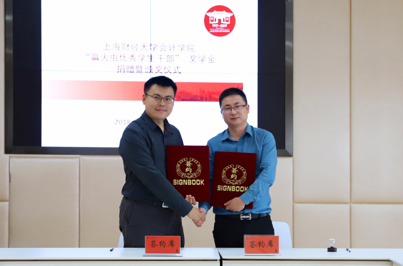在与会嘉宾的见证下,上海财经大学合作发展处副处长、基金会副秘书长王峰与赢火虫信息科技(上海)股份有限公司创始合伙人吴要康先生签署捐赠协议。