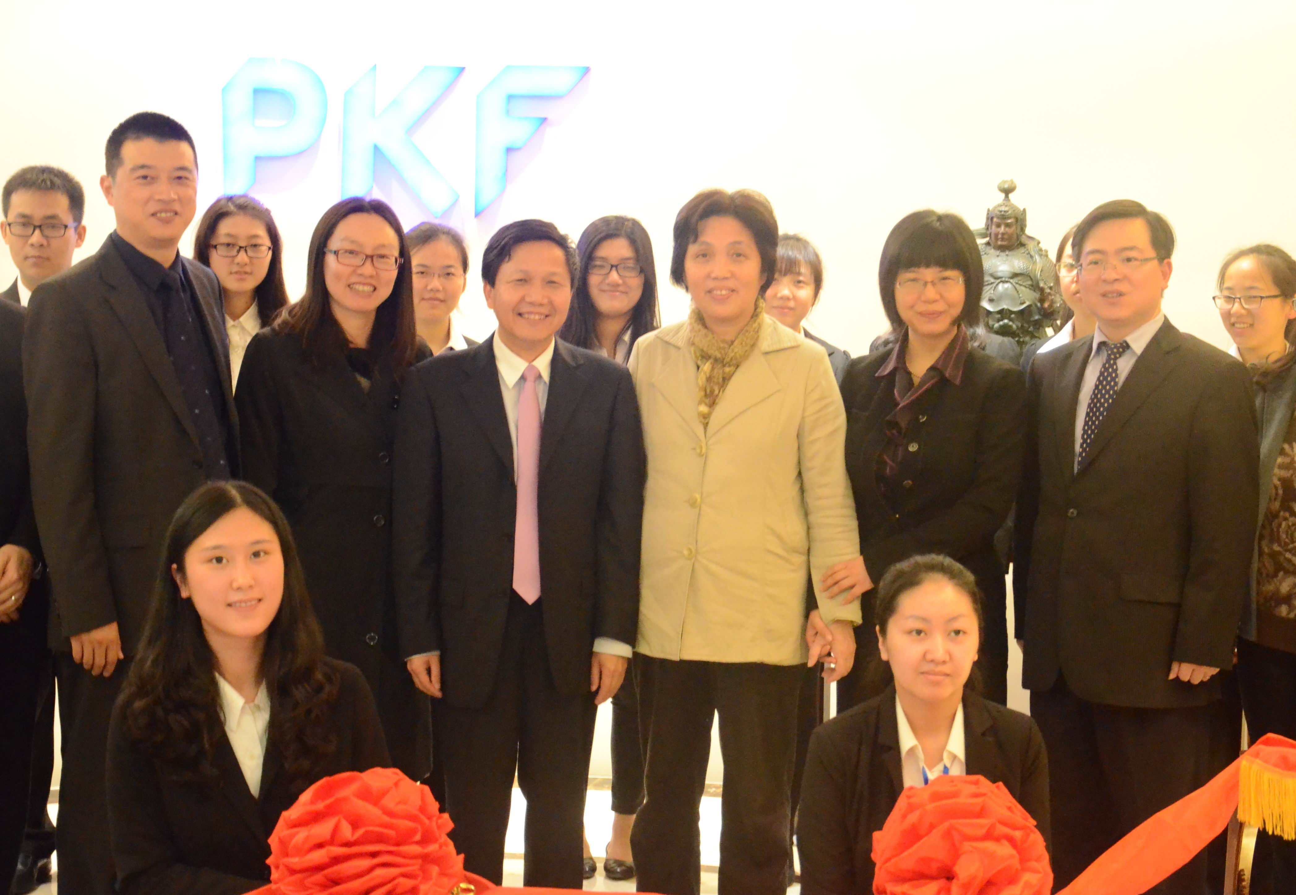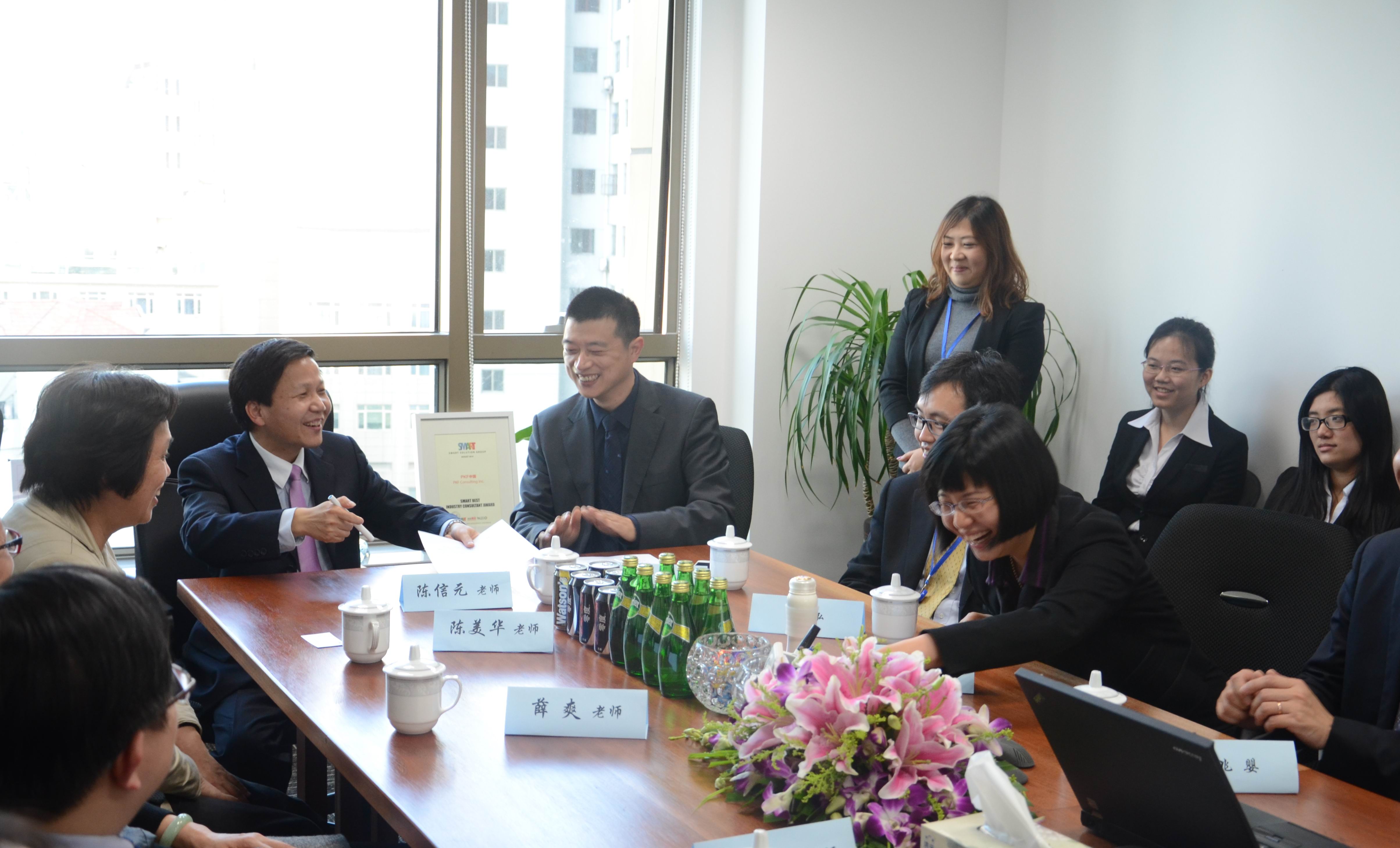2014年11月27日下午,上海财经大学会计学院院长陈信元教授、党委副书记周国良老师、院长助理薛爽教授、学院学生管理办公室主任黄莎老师、13级本科生辅导员朱枫老师以及11位我院学生应邀前往四达会计师事务所参加实习基地签约仪式。