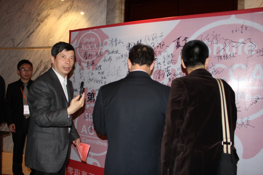 2013年4月14日下午14:30, ACCA“精英校友分享会”在会计学院108室举行。参加精英校友分享会包括近60名专程返校的历届ACCA班的校友和部分在读的ACCA班同学。本次讲座邀请了我校四位历届校友:德勤会计师事务所审计部合伙人顾晓刚先生、亚洲木业财务总监张清先生、上海国际集团财务管理总部副总经理周斌华先生、普华永道合伙人曹健女士。四位校友分享了他们的职场体会和人生感悟,同学们纷纷表示受益匪浅。会计学院党委书记唐家乾老师在分享会结束时为四位校友颁发了纪念品,并与他们合影留念。