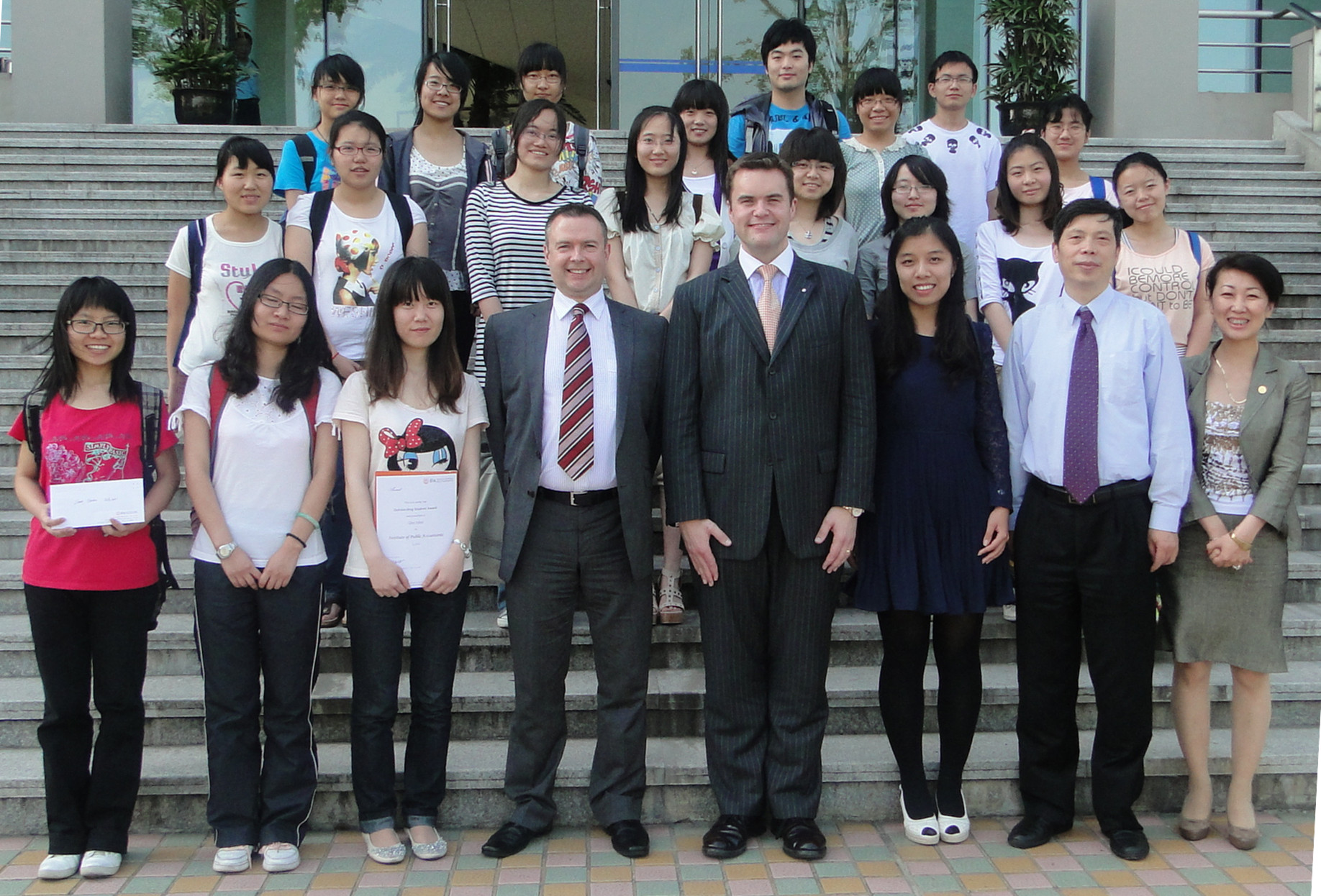 5月28日下午,澳洲公共会计师协会总裁安德鲁.康威先生、市场运营总监亚瑟.布特先生以及中国首席代表陈荣女士来我院为会计班张莎莎、崔晓璐、陈亚涵以及梁加斌等四位同学颁发IPA奖学金。之后,总裁安德鲁.康威先生还为我院学生做了精彩绝伦的演讲并和他们合影留念。