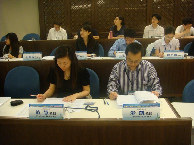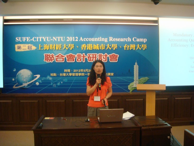 2012年5月26日第二届上海财经大学、香港城市大学、台湾大学联合会计研讨会在台湾大学管理学院隆重召开。上海财经大学会计学院副院长李增泉教授、朱凯副教授、常任轨王兰芳博士、阴慧芳博士、董慧博士、院办主任陈晓东参加了本次会议。王兰芳博士、阴慧芳博士在会议期间作了“Mandatory Adoption of IFRS, Accounting Quality and Investment Efficiency: Evidence from China”和“Competition and Analyst Coverage”专题论文报告,并与台湾大学、香港城市大学教授学者进行了学术交流,取得了良好效果。本次联合会计研讨会为两岸三地会计理论研究起到了推动作用。