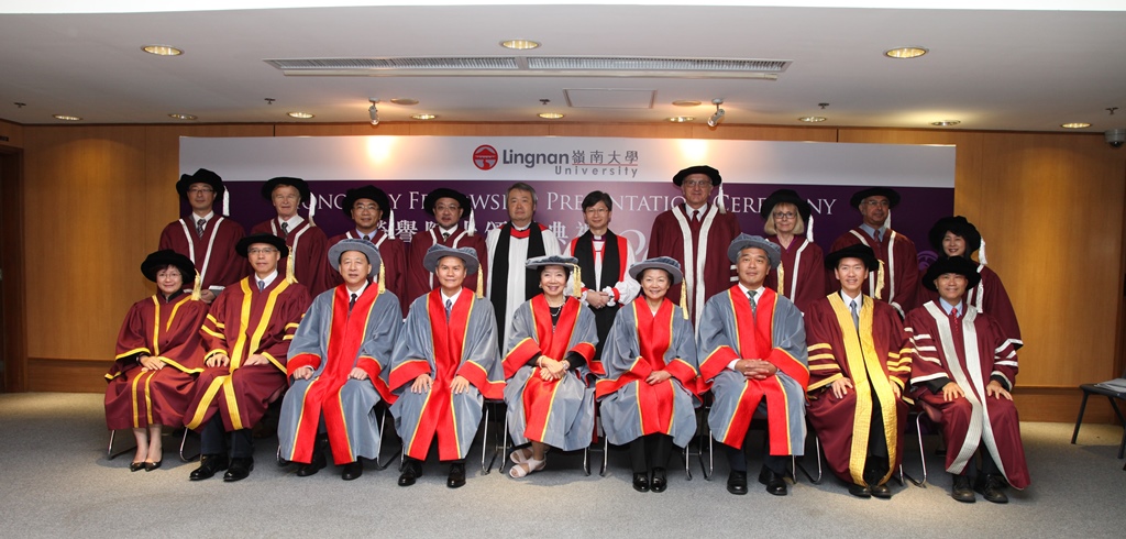 照片中(前排左起)岭南大学校董会司库孙梁励常女士、校董会副主席欧阳伯权先生、荣誉院士汤云为教授、荣誉院士邓树荣先生、荣誉院士包陪庆教授、荣誉院士梁刘柔芬太平绅士、荣誉院士陈禹嘉先生、校董会主席陈智思议员太平绅士、郑国汉校长及(后排)岭大管理高层于「2013年度荣誉院士颁授典礼」合照。