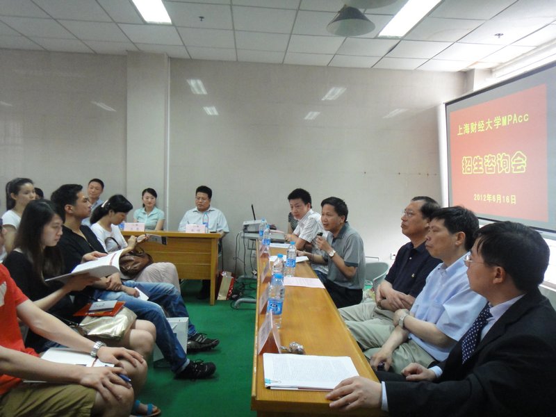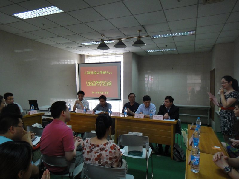 为方便考生了解我校会计硕士专业的特色和报名考试程序,2012年6月16日(星期六)下午2点在369校区大礼堂附楼(玻璃房)举行MPAcc招生咨询会。研究生院领导陈启杰老师,研招办领导金星老师、沈华老师,会计学院院长陈信元老师,会计学院党委书记唐家乾老师、MPAcc中心主任周国良老师,10级校友程明、吴惠明,11级学员王亮、吴妍雯,12级学员张嘉吉,还有上财MPAcc合作伙伴ACCA、CIMA办事处的代表老师出席了招生咨询会。