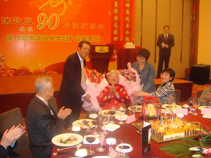 徐政旦教授学生东方国际集团财务总监徐建新博士、上海财经大学会计学院副教授王英姿博士代表全体学生为导师献花