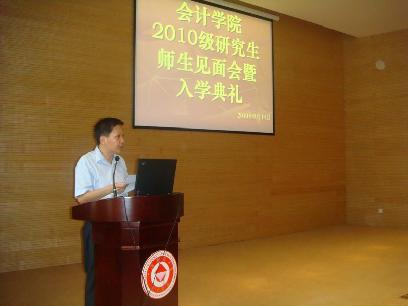 2010年9月14日会计学院分别举行了2010级本科生及研究生师生见面会,会议由陈信元院长致辞,朱红军副院长介绍专业情况,李增泉副院长代表教师发言,蒋义宏教授为研究生介绍出国交流项目的情况。会上,李常安同学和张璇同学分别代表学院的在校研究生和新生作了精彩发言。