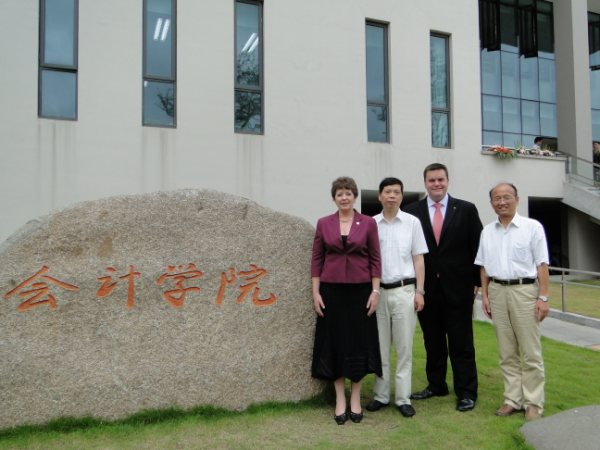 澳大利亚国家会计师协会(NIA)主席Christine Leetham女士和总裁Andrew Conway先生一行四人于2010年6月25日上午对我院进行友好访问。首先,我院党委书记唐家乾老师和副院长潘飞教授在会计学院贵宾室与到访的客人亲切交谈,双方肯定了一年来的合作成果,并愿意共同努力继续推进双方战略合作伙伴关系。NIA客人对我院的节约环保、国际化的办学理念非常认同,并高度赞扬了我院所取得的教学成果。其次,我院副院长潘飞教授向NIA总裁Andrew Conway 先生颁发了客座教授证书,我院党委书记唐家乾老师向NIA主席Christine Leetham 赠送了礼物。最后,双方在学院门口合影留念。