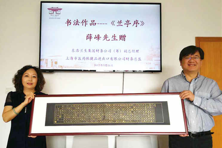 2017年9月16日上午,上海财经大学会计学院MPAcc2014级校友,时任东浩兰生集团财务公司(筹)副总经理、上海市医药保健品进出口有限公司财务总监薛峰先生,值母校百年华诞之际,向上海财经大学会计学院MPAcc中心赠送书法作品《兰亭序》,会计学院院长助理、MPAcc中心主任张纯代表学院接受捐赠。