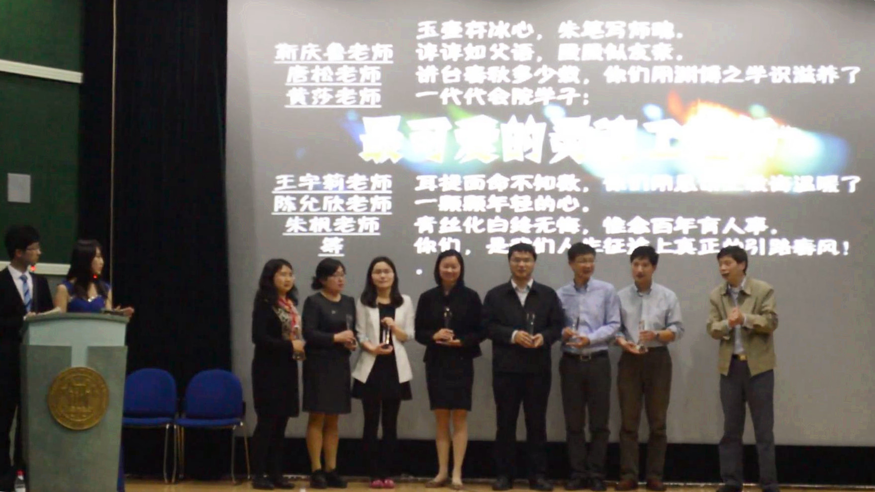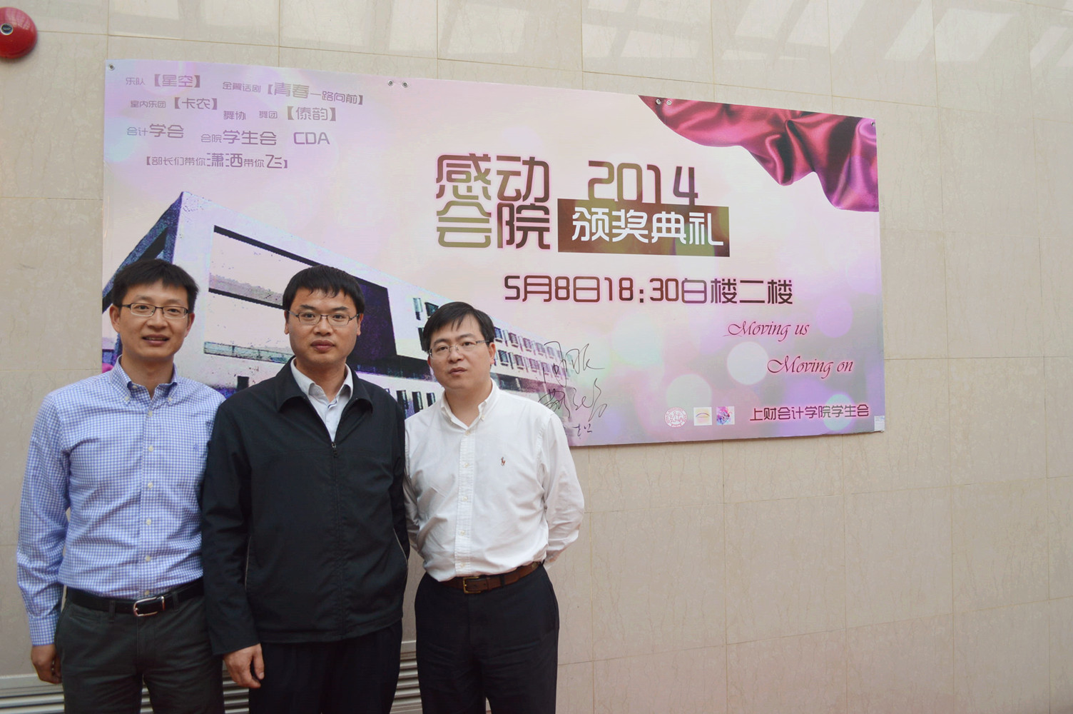 2014年5月8日晚18:30,“感动会院”颁奖典礼在行政楼二楼报告厅隆重举行。会计学院党委书记唐家乾老师,党委副书记周国良老师,会计与财务研究院副院长靳庆鲁老师,会计学院唐松老师,王延明老师,范增老师,会计学院办公室主任黄莎老师,研究生辅导员王宇莉老师,辅导员赵果老师,辅导员陈允欣老师和辅导员朱枫老师等受邀出席了晚会,在场观众有近300人,场面热烈。