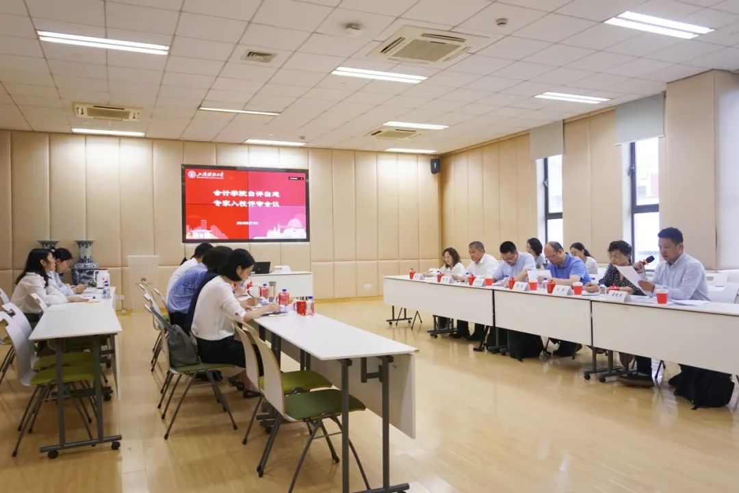 为了进一步推进本科教育教学自评自建工作(以下简称“自评自建工作”),6月19日上午,由上海交通大学教务处副处长朱燕民,同济大学经济与管理学院副院长(主持工作)谢恩,上海财经大学金融学院副院长曹啸,上海财经大学校督导组成员王霞,上海财经大学院督导组成员张纯组成的自评自建专家组莅临我院,对会计学院自评自建工作进行现场考察。本次自评自建专家入校评审会议在会计学院106室顺利召开,会计学院院长靳庆鲁,党委书记郑继红,副院长唐松、周波以及学生办公室主任赵果等参加会议。会议由上海财经大学教务处副处长吴纯杰以及专家组组长朱燕民主持。