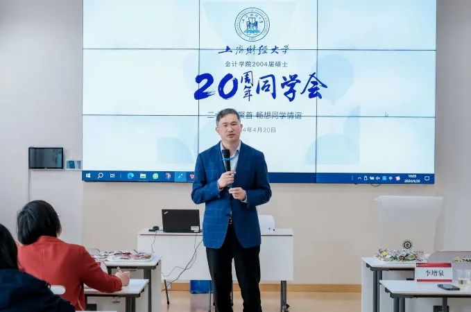 下午,2004届硕士校友毕业二十周年返校座谈会在会计学院108室举行。上海财经大学副校长李增泉代表学校热烈欢迎校友们的到来,并深入分析了当前的宏观经济环境,介绍了近年来学校发展情况以及当前学校专业课程设置改革,抓住时代机遇应对挑战举措等。他强调,校友是学校精神的传承者和弘扬者,是推动学校改革发展的重要力量。学校与校友之间的紧密联系和深度合作,对于推动学校的持续发展和提升学校的社会影响力具有深远意义,希望校友们在未来的日子里继续关心和支持学校发展,共铸上财新荣光!